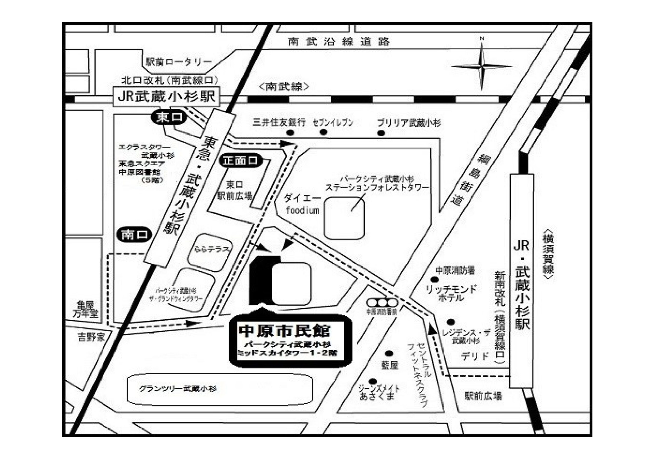 - 川崎市中原市民館:川崎市中原区新丸子東3-1100-12 パークシティ武蔵小杉ミッドスカイタワー1・2階 JR南武線「武蔵小杉駅」JR横須賀線「武蔵小杉駅」東急東横線・目黒線「武蔵小杉駅」各駅より徒歩3~4分